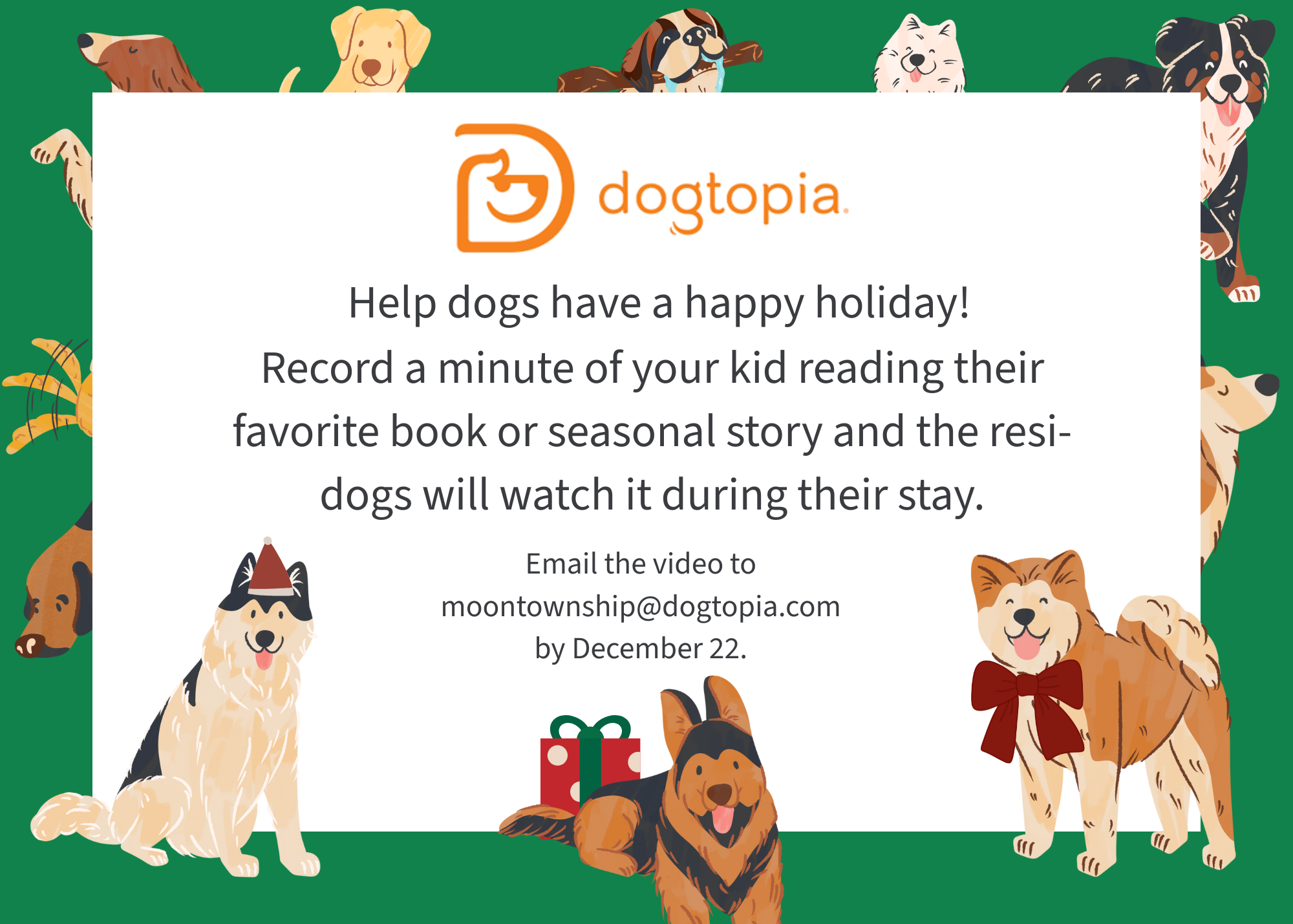 Dogtopia of Moon Township wants your help! The caregivers at Dogtopia want kids to read a few pages or minutes of their favorite book or seasonal story. Then, over the holidays, the resi-dogs will watch the videos during a storytime just for them. Each recording only needs to be one ...