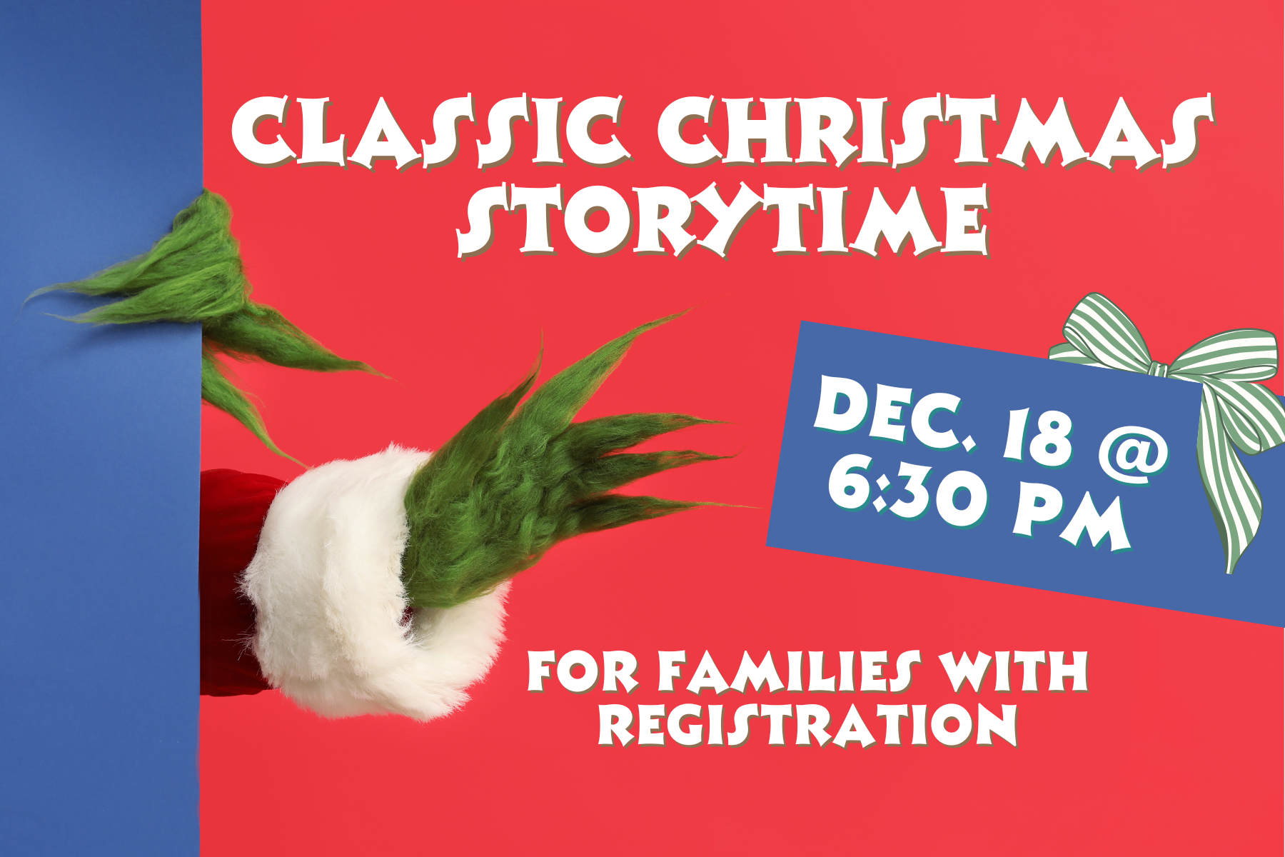 Feel your heart grow three sizes on the day of December 18 by participating in a classic Christmas storytime with us at 6:30 PM. Wear your holiday clothes and be full of cheer -- just don't be too loud with your floo-floobers or sloo-slonkers. Families with registration welcome. Reserve your ...