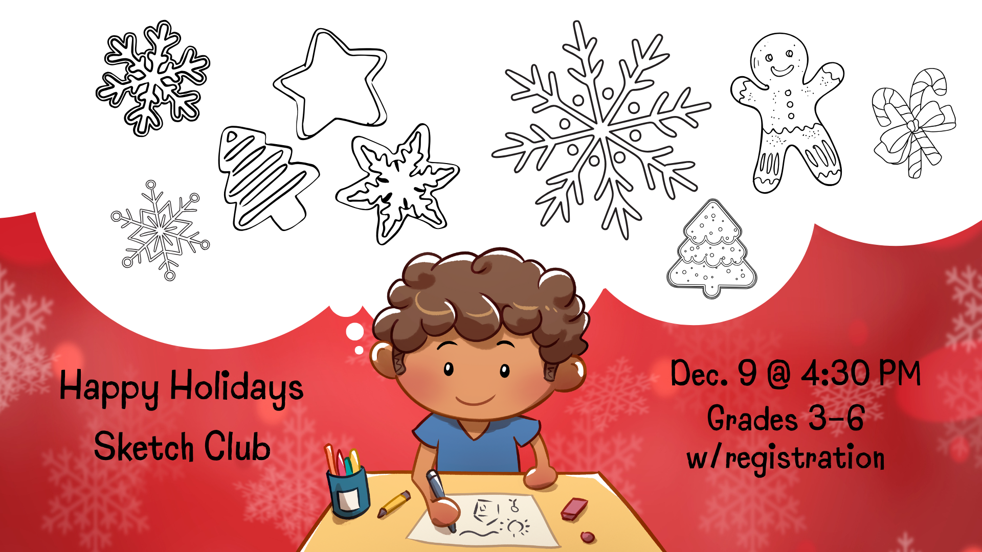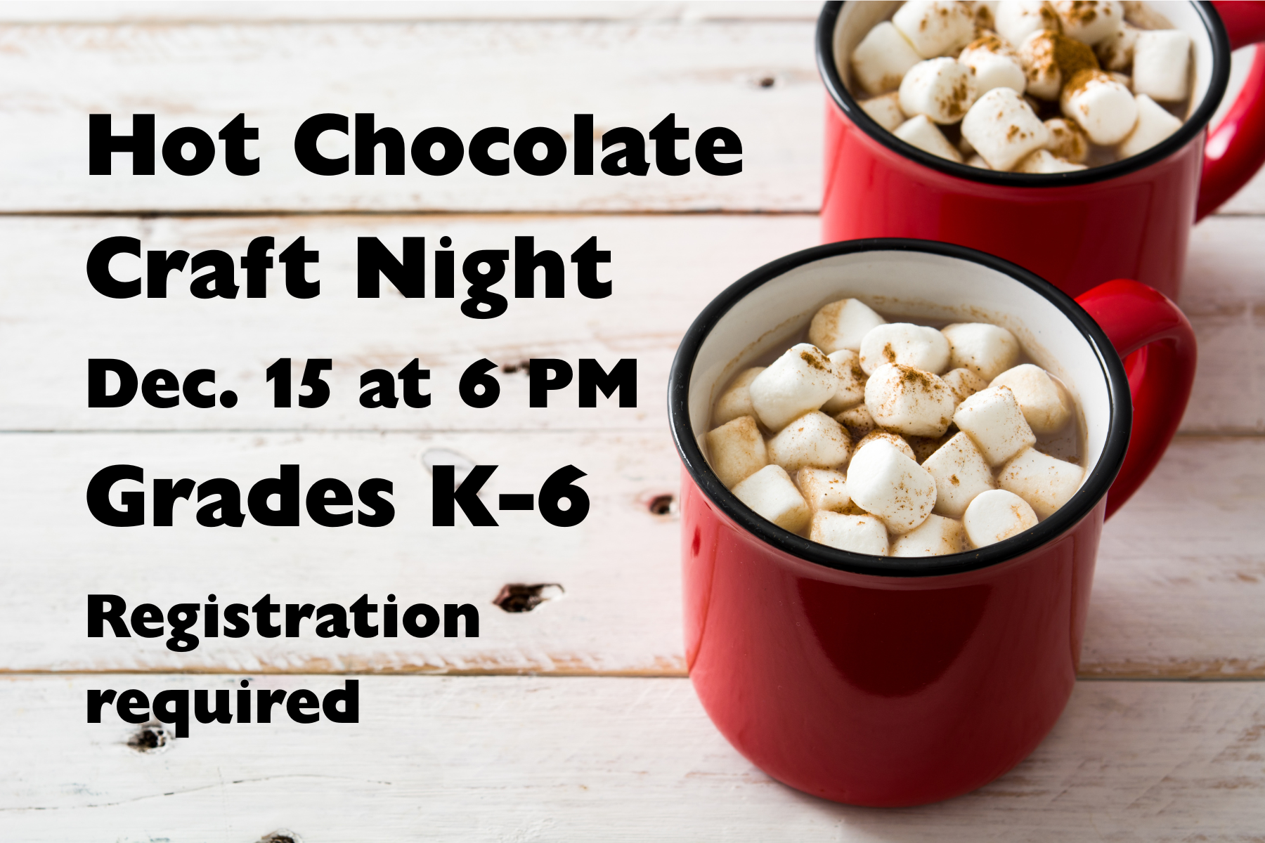 Get ready for a lovely and warm evening of crafting! On December 15 at 6 PM, we’ll supply the goods for a hot chocolate bar and put on some classic holiday tv specials on while you work. For grades K-6. Register online or call 41-269-0334 ...