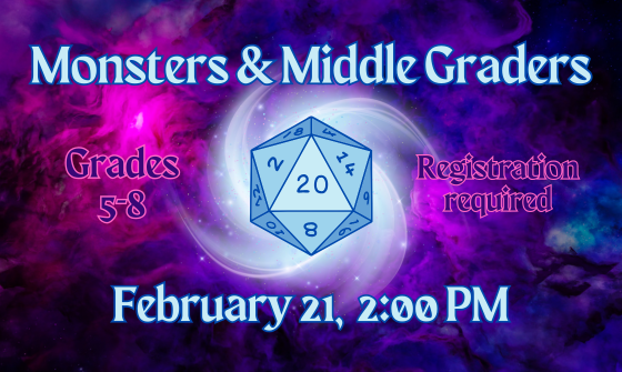 Ever wanted to play Dungeons & Dragons but never had the chance? Are you an experienced player and need more excuses to roll d20s? Play with our DM Roxanne in her 5e homebrew setting of Fensprall! Players in grades 5-8 will participate in a level 1-3 beginner-friendly adventure on February 21 ...