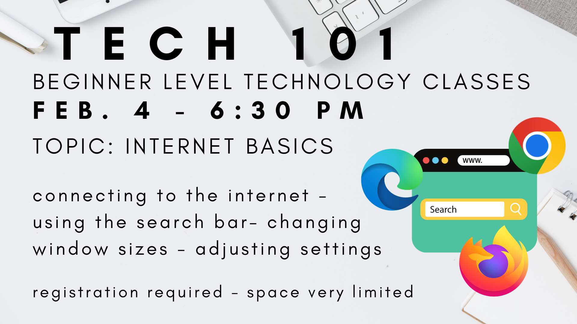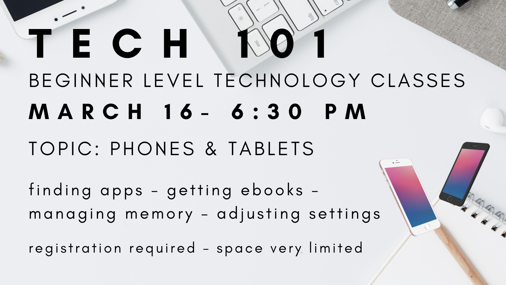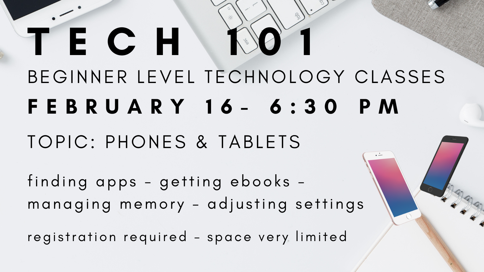Behind or new to technology? Come to our Tech 101 classes for adults to learn beginner level computer and smart device tips in small, exclusive tutoring sessions with our technology librarian Ms. Roxanne. The Tech 101 class on February 16 at 6:30 PM will focus on finding apps, managing memory ...
