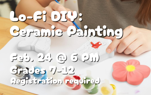 Join us for Lo-Fi DIY, a fun low-tech crafting program with a few snacks and some relaxing music. On February 24 at 6 PM, grades 7-12 will paint a turtle, a gnome, or ghost ceramic figurine. Register online or call 412-269-0334 ...