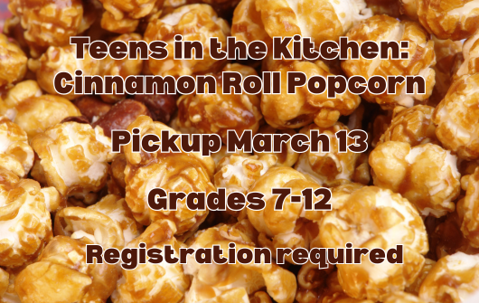 It's time to let your inner chef loose! Teens in grades 7-12 can register for a kit to make a batch of sweet cinnamon roll popcorn. Pickup is March 13. Register online or call 412-269-0334 ...