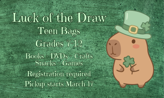 Want to try your luck? Teens in grades 7-12 can sign up to receive a fun bag with surprise books and DVDs curated to their interests, a miscellaneous craft, puzzle/word games, and delicious snacks. All bags can be picked up on Tuesday, March 17th from 10 AM-8 PM. Register online ...