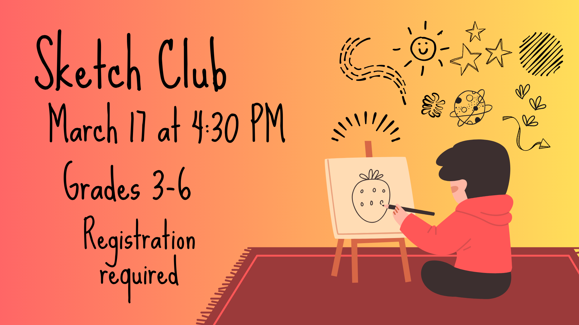 Grades 3-6, join Miss Nicole once a month to learn how to sketch! Every month will be a special prompt/theme that our drawings will be based on. It can be an exact recreation or you can use the prompt to think of all sorts of creations. We'll chat about what ...