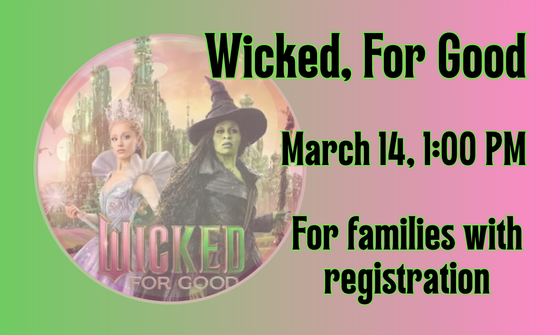 Bring your friends and some comfy pillows. On March 14 at 1 PM, we're watching Wicked, For Good and crafting away. We might even have some pretty wicked snacks...and if the mood hits, we can sing along! For families with registration. Register online or call 412-269-0334 ...